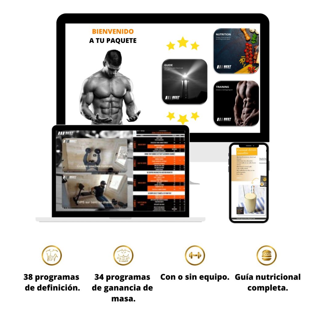 En este paquete encontrarás los 72 mejores programas de entrenamiento, realizables con o sin equipo para ganar masa y definir. También se incluye una guía nutricional completa con ejemplos de planes alimenticios. Accesibles al instante desde tu teléfono móvil, tableta o computadora.